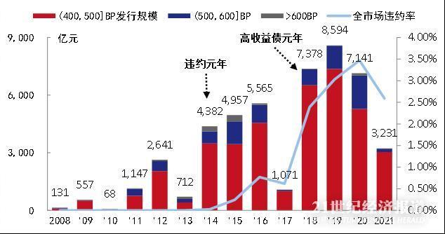 表2 2008-2021年全市场累积总违约率为2.70%,高收益债主体违约率显著高于全市场