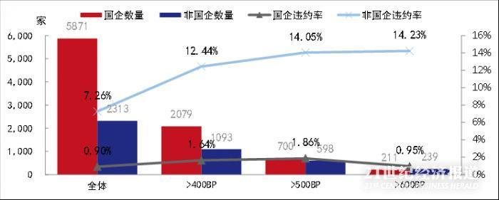 ,且风险溢价水平越高,国企和非国企的违约率差异也同步加大,投资者更容易根据不同的风险偏好挖掘出适合的投资标的。