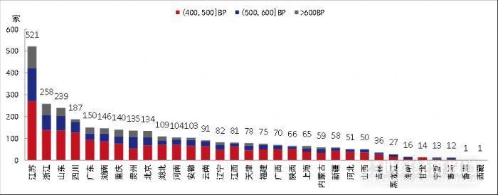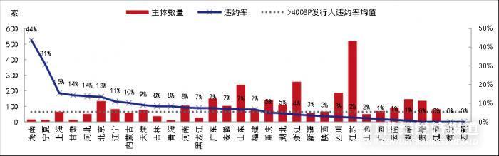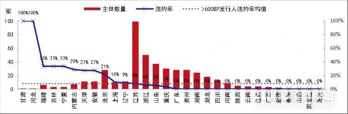 我们再来看一下高收益债发行主体在各地区的分布和违约特征。从绝对数量来看(图3),江苏是高收益债主体的绝对大省,主体数量高达521家,是第二名的两倍之多,占整体高收益债主体的16.4%;其次是浙江和山东,均在200家以上。在利差>400BP(图5)、>500BP(图6)、>600BP(图7)三组高收益主体中,江苏、浙江、山东均是排名前三。重庆以140家跃居第七名,其它网红地区如贵州、云南、天津则分别以135家、91家、78家分居第八、十三、十六位。