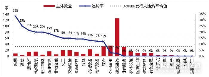 行业分布和违约特征方面,从统计数据来看,建筑装饰是高收益主体数量最多的行业,仅其一个行业就占全部高收益主体的35%;其次是综合、房地产、公用事业,也是一级市场高收益债发行主体的主要分布行业(图8)。前四个行业占全部高收益主体的60%。但建筑装饰、综合行业的高收益主体中有较大比例为城投,也就是说有相当数量的弱资质城投其发行利差还是偏高的。
