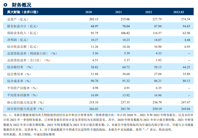 中诚信国际认为,2022年以来,英大泰和财险以股东业务为基石,充分发挥股东资源和渠道优势,推动非车险业务持续增长;但受调结构、控品质影响,公司车险业务规模有所下降。同时,公司投资资产质量仍需持续关注。此外,偿二代二期规则下,公司偿付能力有所波动,考虑到未来业务的持续发展、资本市场不确定性增强等因素的影响,公司仍需持续加强资本管理,持续优化资本结构。