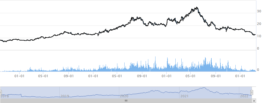 从那之后,就一直回撤到现在的12元,腰斩都不够,还得再补一刀。