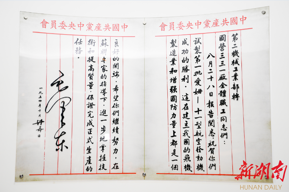 1954年8月16日,中国第一台M-11型航空发动机试制成功。10月25日,毛泽东亲笔签署贺信进行嘉勉。
