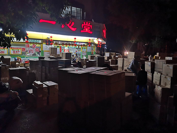 一心堂工作人员深夜搬运应急物品